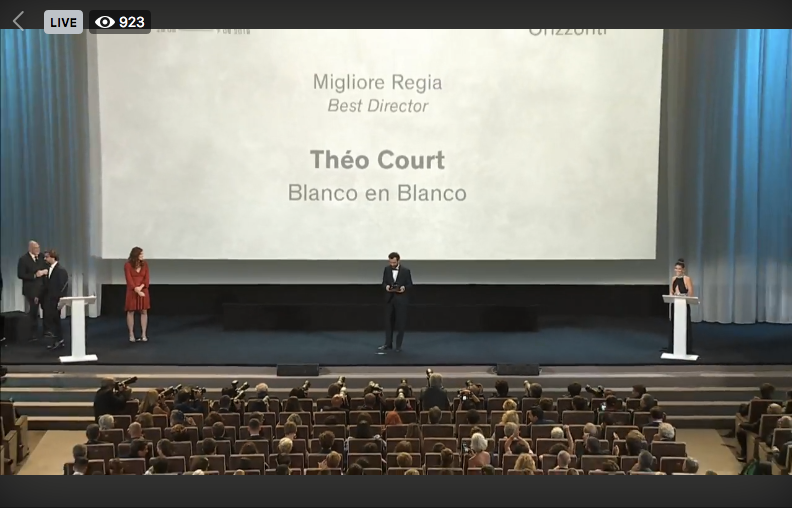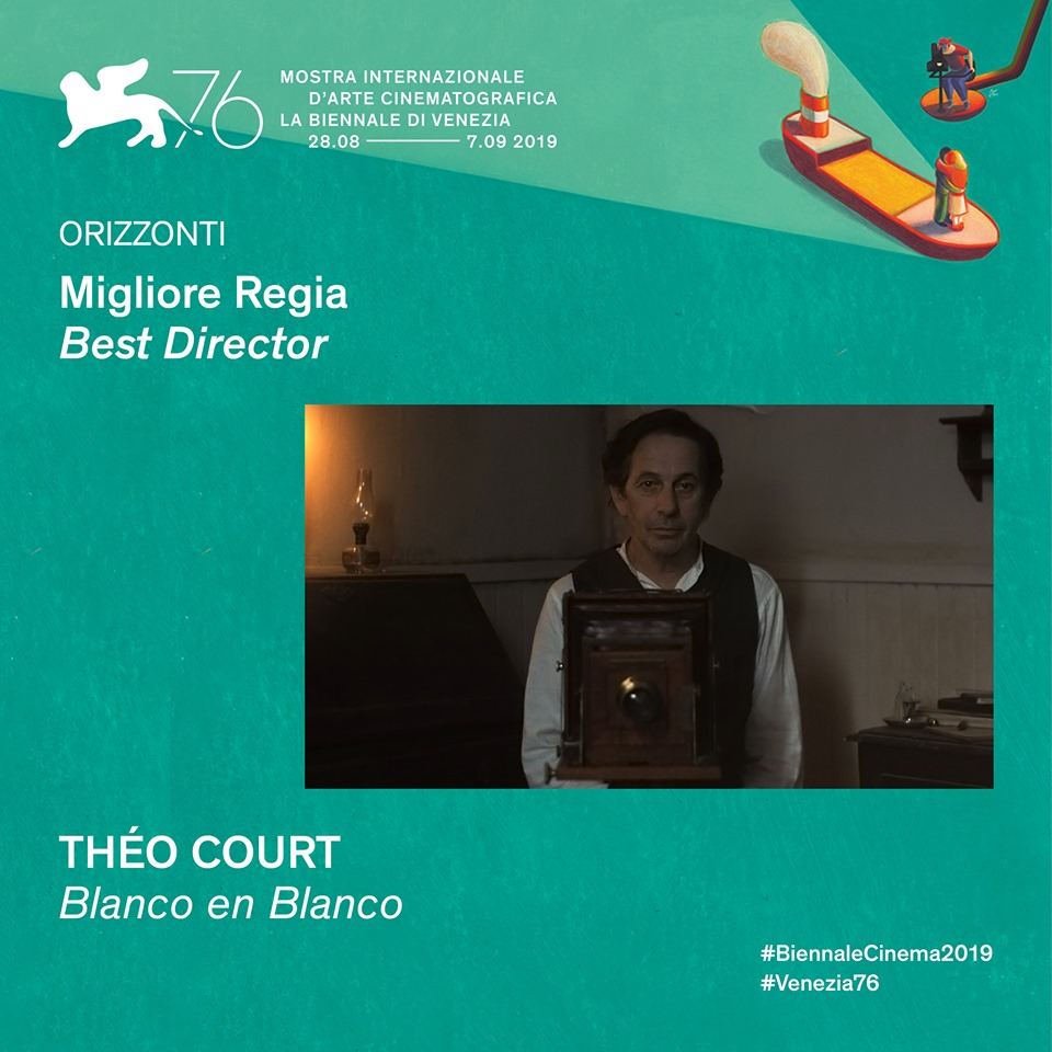 Le long métrage chilien BLANCO EN BLANCO, réalisé par Théo Court et écrit par Théo Court, Samuel Delgado et Laure Desmazières obtient le prix du meilleur réalisateur à la Mostra de Venise, section Orizzonti.